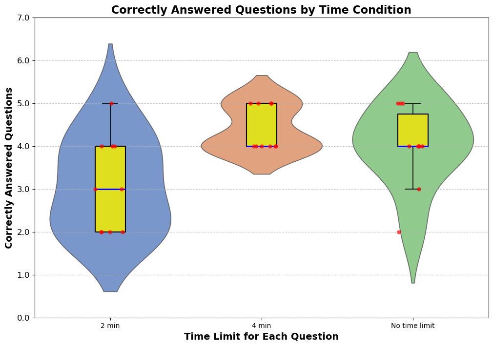 Raincloud box plot shows how many correctly answered questions the participants had across different time conditions.