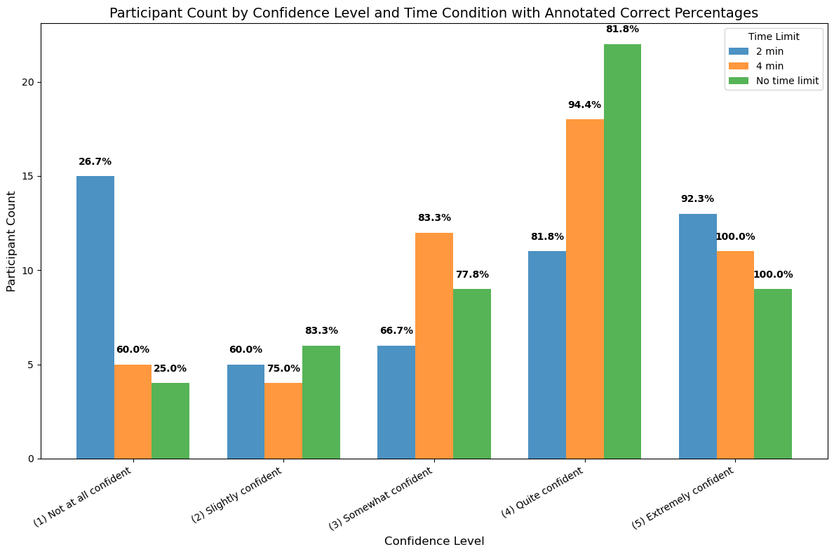 Bar chart illustrates the distribution of participant counts across five confidence levels for the three time conditions (2 minutes, 4 minutes and no time limit), with annotated percentages representing average correct counts based of participant count achieved within each group.